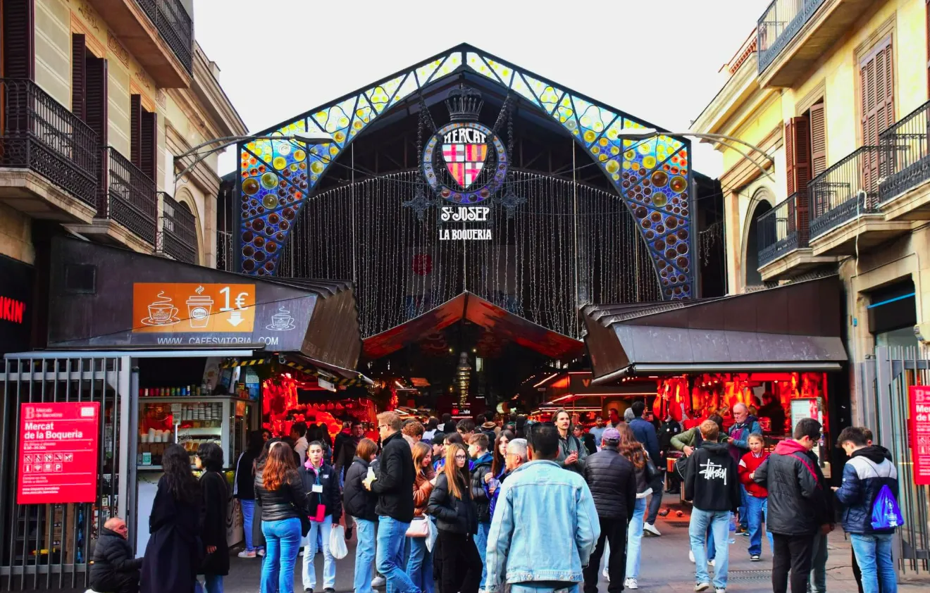 Розташований прямо на Рамблі, продуктовий ринок зустрічає гостей вітражними воротами і жвавою атмосферою. Під дахом із заліза і скла — сотні прилавків з продуктами, делікатесами і вуличними закусками. Тут можна перекусити біля стійки з тапас, спробувати свіжовичавлений сік або спостерігати, як кухар обсмажує кальмарів прямо перед вами.